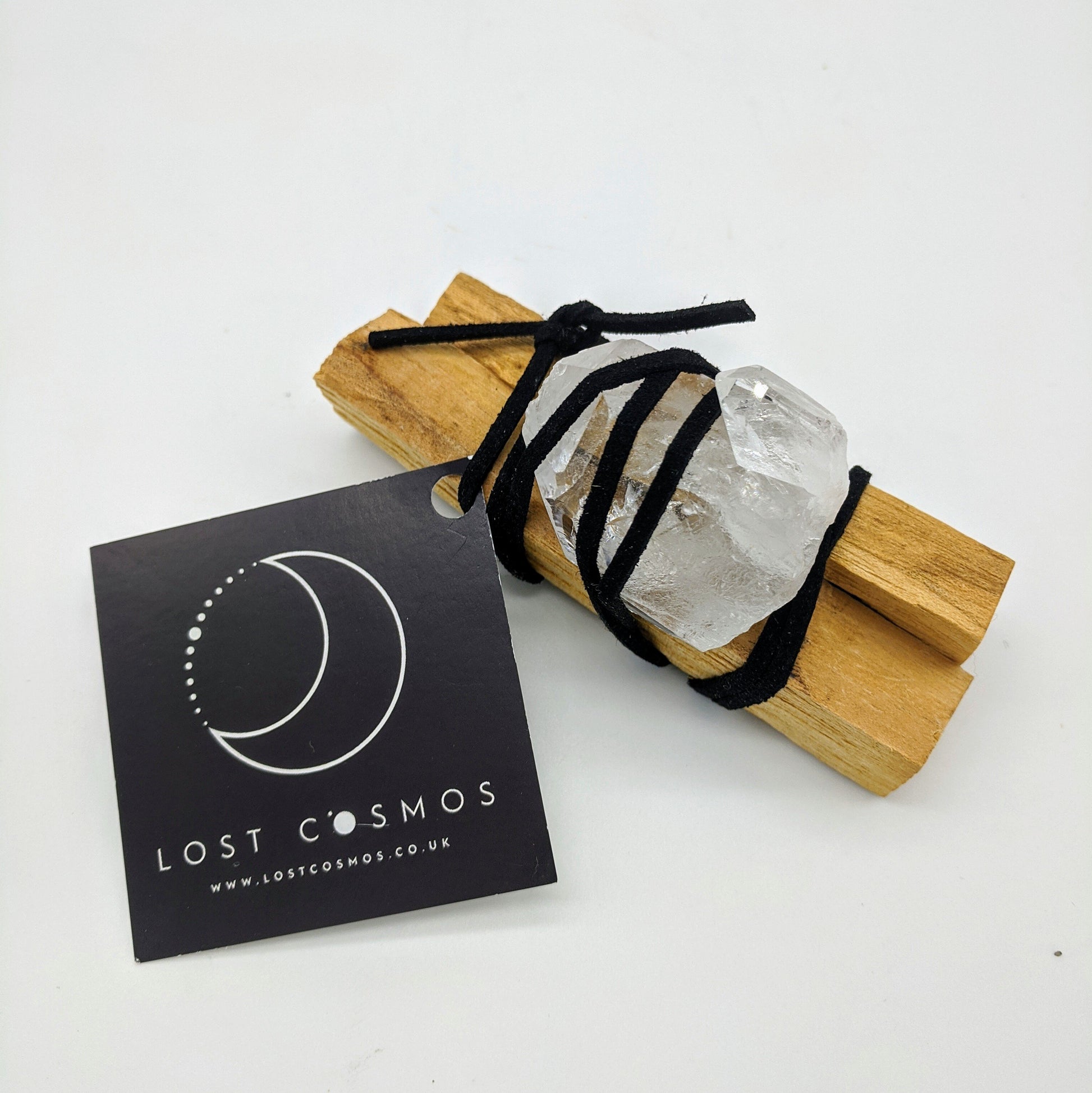 Palo santo is used to treat a wide variety of physical ailments including colds, flus, anxiety, depression, asthma, bronchitis, headaches, and emotional trauma. The wood can help brighten energy and promote feelings of positivity and joy. The scent is also shown to reduce stress and anxiety, and enhance clarity and concentration. Our Palo Santo is hand wrapped with Reiki charged Clear Quartz points, making these the perfect cleansing kits for any ritual, or as a grounding tool before meditation.